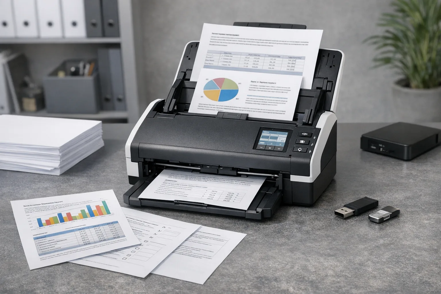 Automatische Funktionen wie Duplex, automatischer Einzug (ADF) und Presets arbeiten zusammen, um Scan-Jobs schneller und zuverlässiger zu machen. Duplex sorgt dafür, dass beide Seiten eines Blatts ohne manuelles Wenden erfasst werden. Der ADF nimmt ganze Stapel auf und schafft Batch-Verarbeitung. Presets speichern die richtigen Einstellungen für verschiedene Dokumenttypen. Kombiniert reduzieren diese Funktionen Zeitaufwand, Nachbearbeitung und Fehlerquellen.
